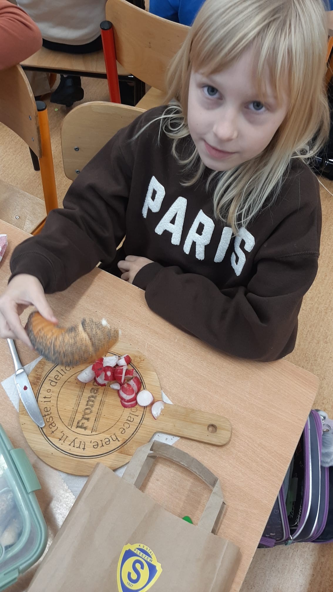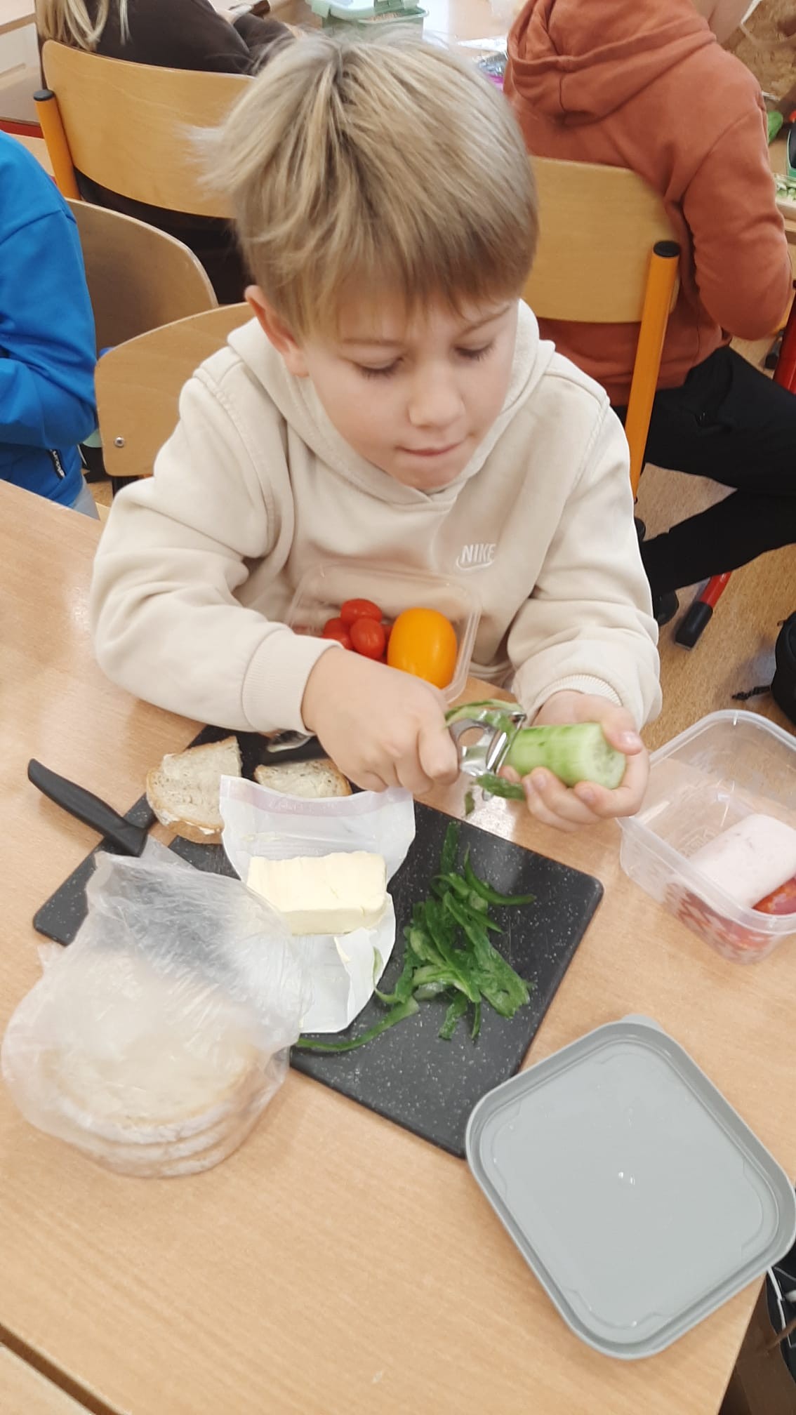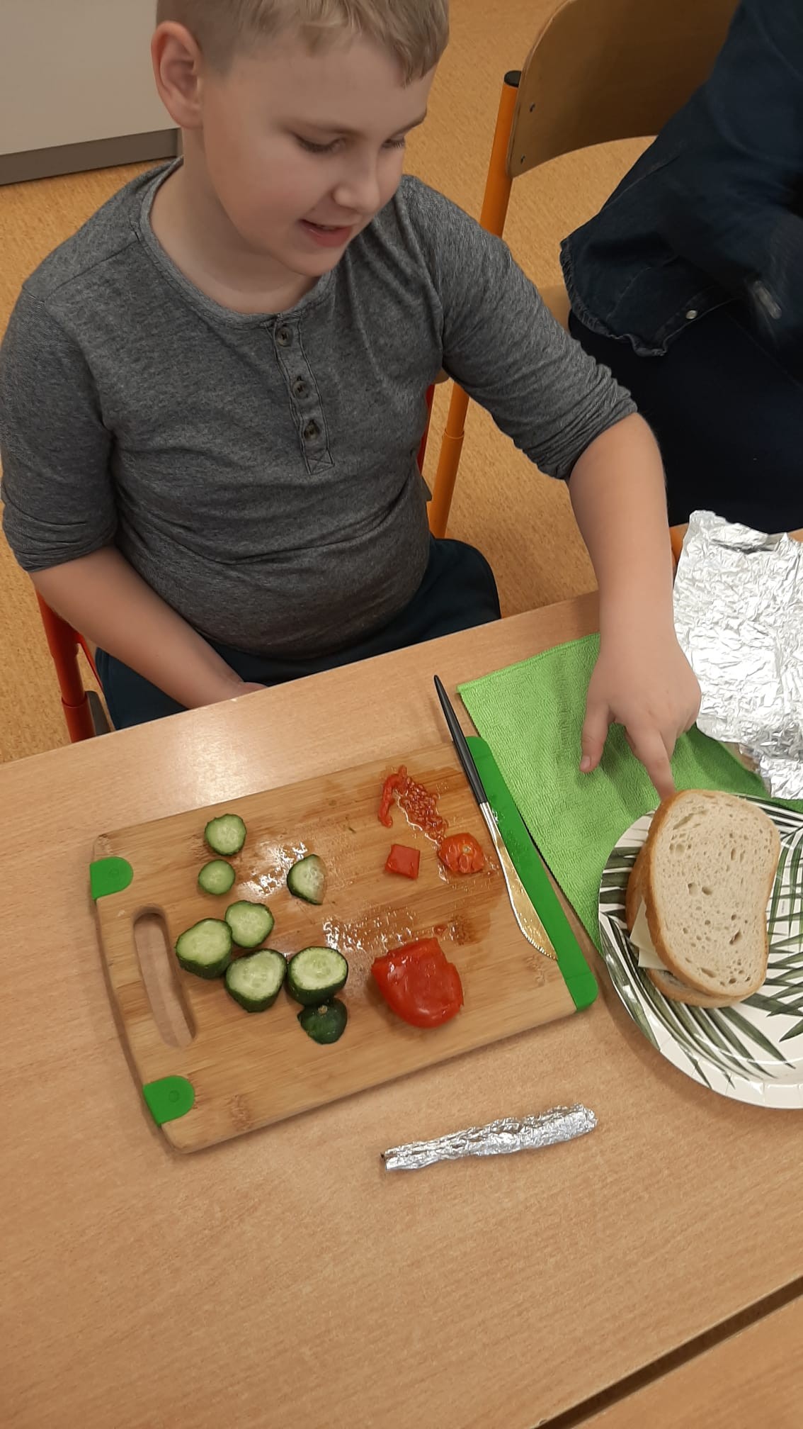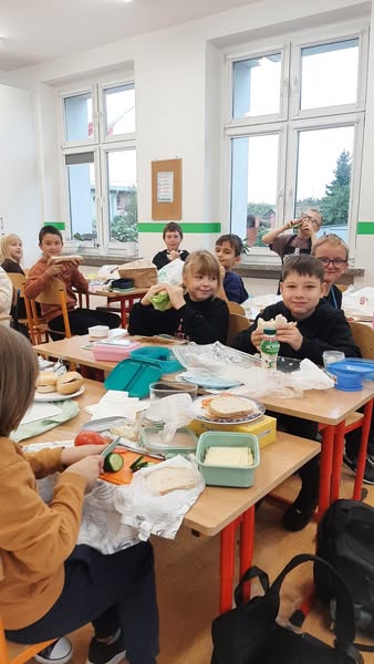 W ramach tygodnia poświęconego zdrowemu odżywianiu w klasie 2, uczniowie przygotowywali zdrowe, kolorowe kanapki. Pomysłowość i kreatywność dzieci nie miały granic – powstały kanapki w kształcie zwierzątek oraz wesołych buziek. Mimo jesiennej aury, w sali panowała radosna i pełna energii atmosfera, a na talerzach królowały świeże warzywa i zdrowe dodatki. Dzieci udowodniły, że zdrowe odżywianie może być smaczne, ciekawe i kolorowe nawet jesienią! ![]()