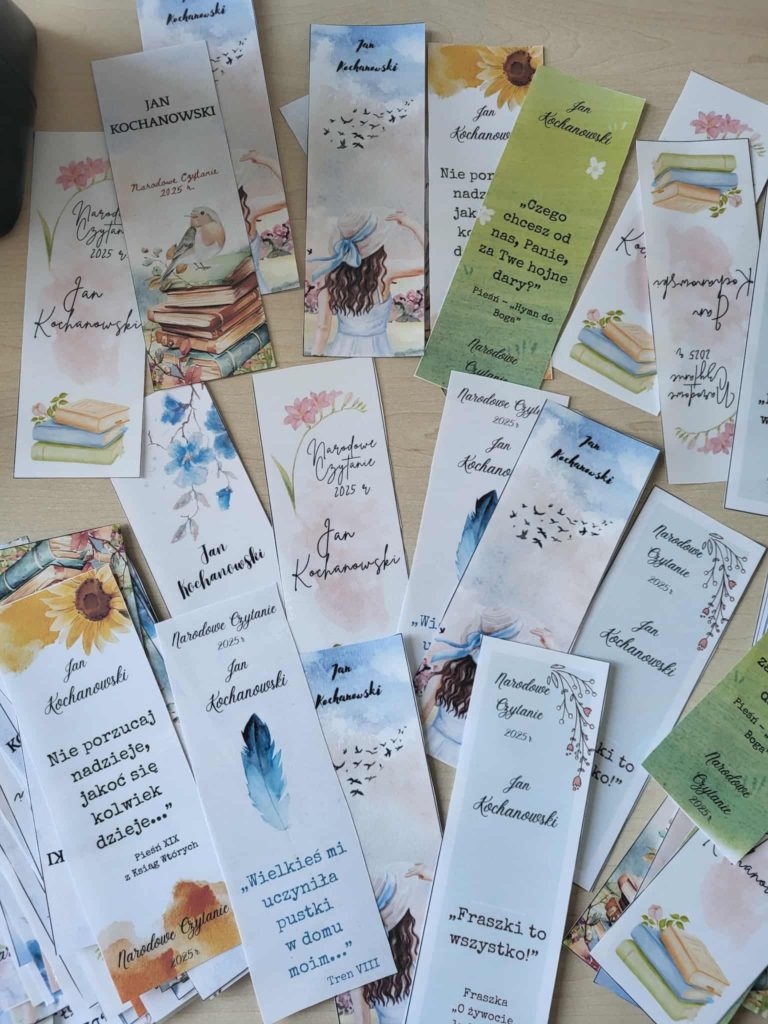 5.09.2025r. w naszej szkole odbyło się Narodowe Czytanie Jana Kochanowskiego Klasa 8 przygotowała prezentacje o życiu i twórczości pisarza oraz odczytała najbardziej znane fraszki Na koniec wszyscy uczestnicy otrzymali pamiątkowe zakładki do książek