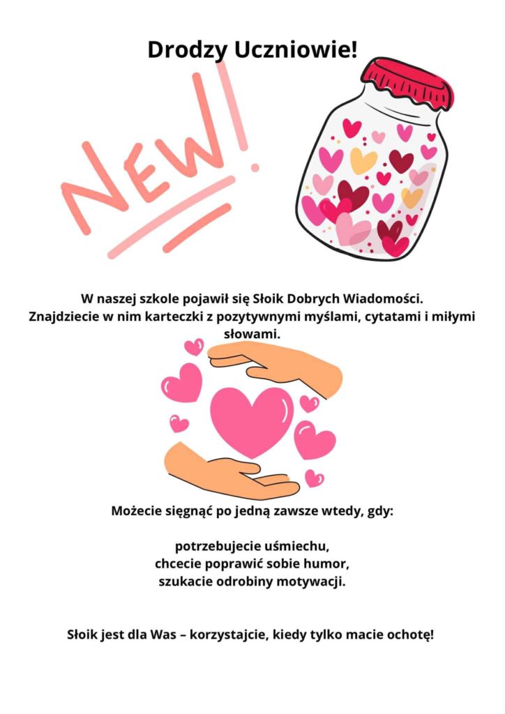 Nowa inicjatywa w naszej szkole! Pani psycholog przygotowała dla uczniów słoik pozytywnych myśli . Każdy może sięgnąć po karteczkę i zabrać ze sobą dawkę dobrego słowa na cały dzień Drobny gest, a potrafi wywołać uśmiech i poprawić humor!